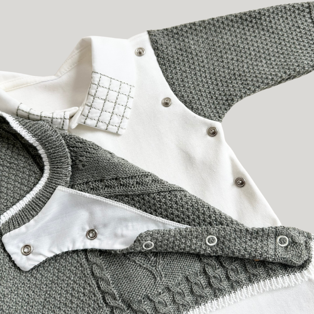O Kit Saída Maternidade Nature Green foi pensado para marcar com estilo e serenidade o primeiro capítulo da história do seu bebê. Composto por duas peças em tricot de alta qualidade, ele combina sofisticação e suavidade para os primeiros dias fora do útero.