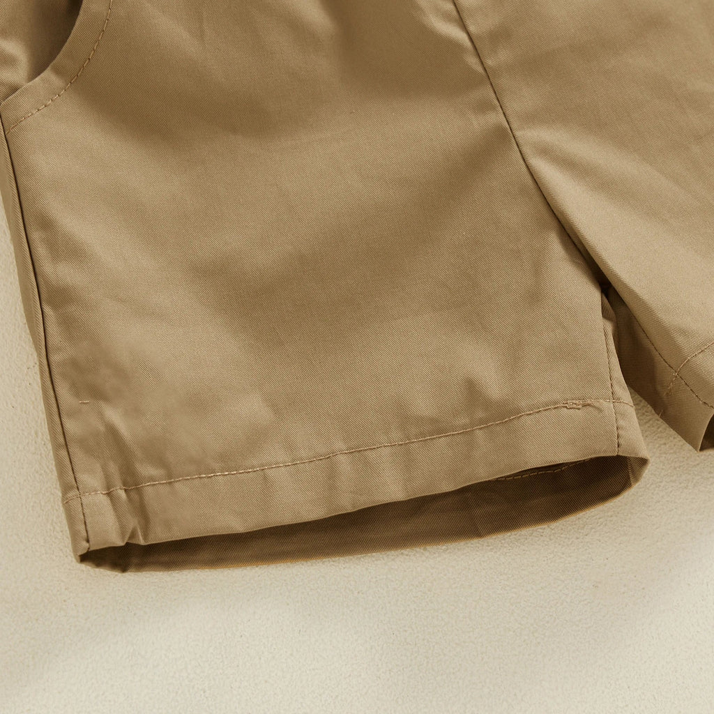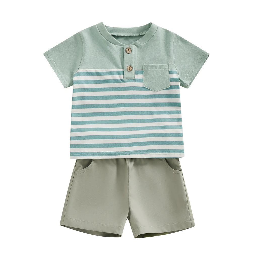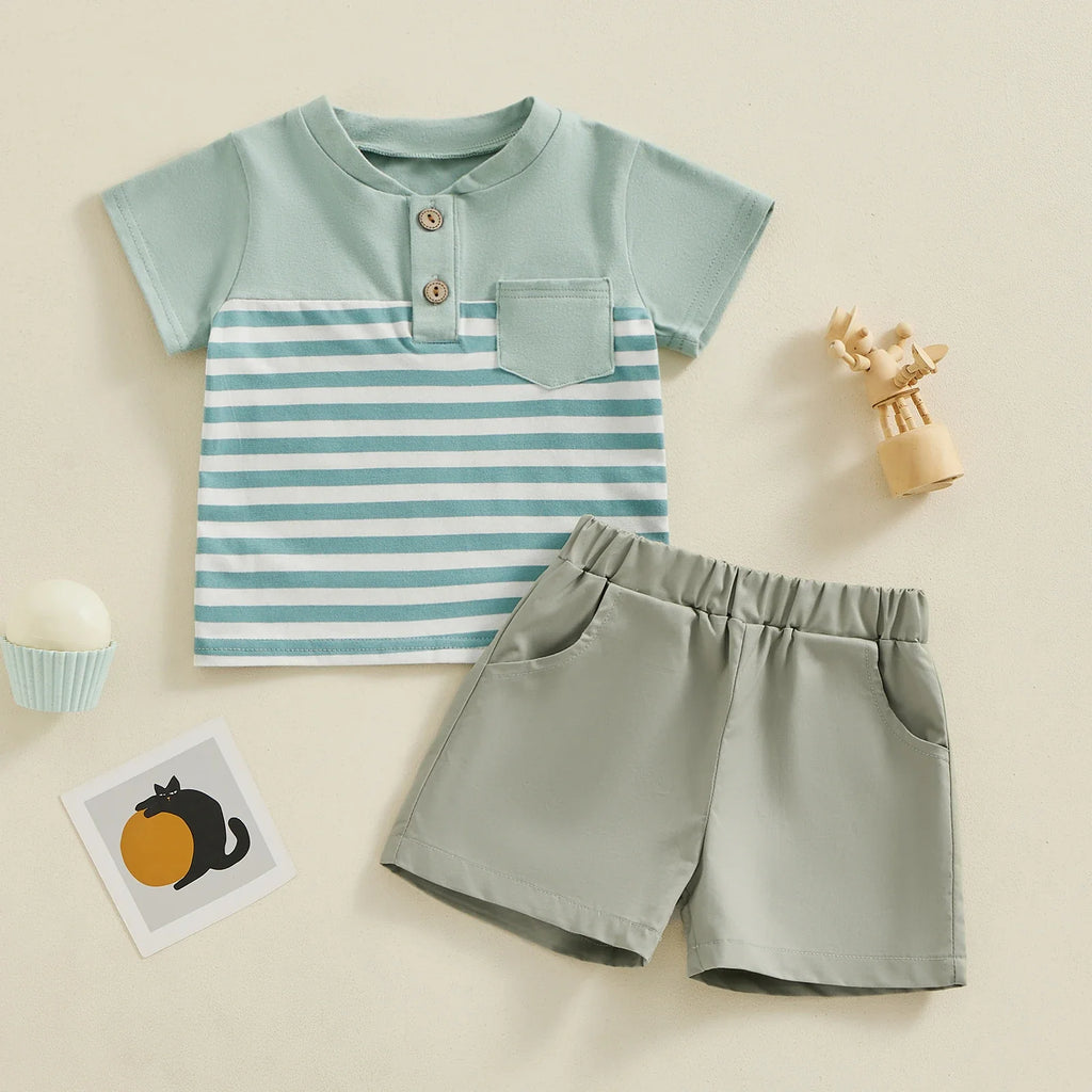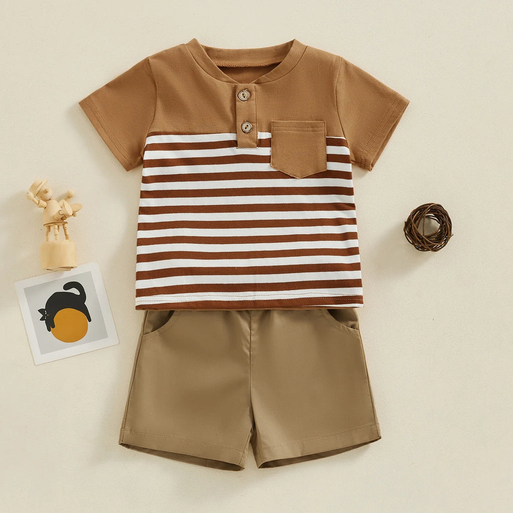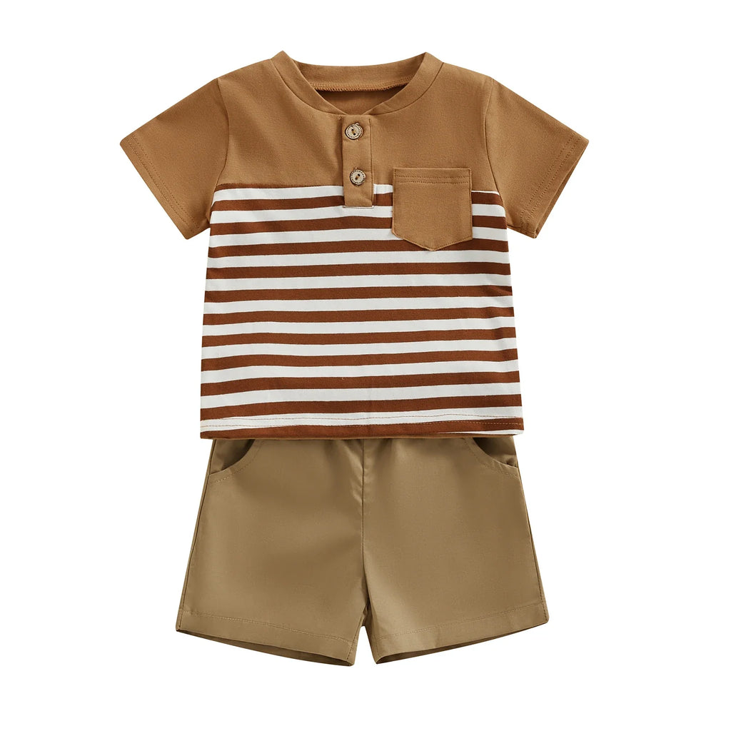 Lindo conjunto composto por camisa com detalhe listrado e bermuda, confeccionado em algodão e poliéster de alta qualidade.