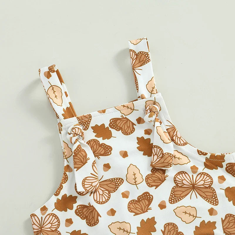 Feita em algodão leve e respirável, a Jardineira Borboletinha traz uma estampa delicada com borboletas e folhas, além de um babado encantador na barra que transforma qualquer passo em poesia.