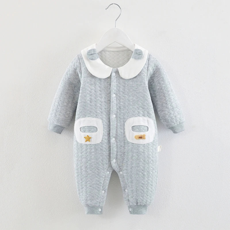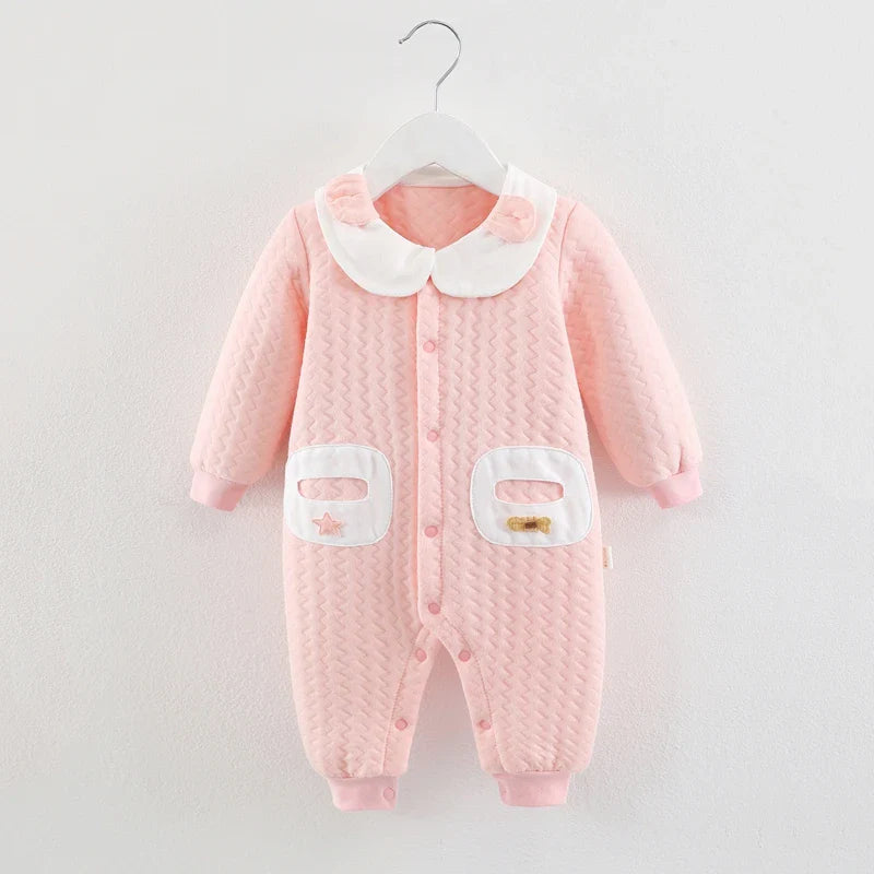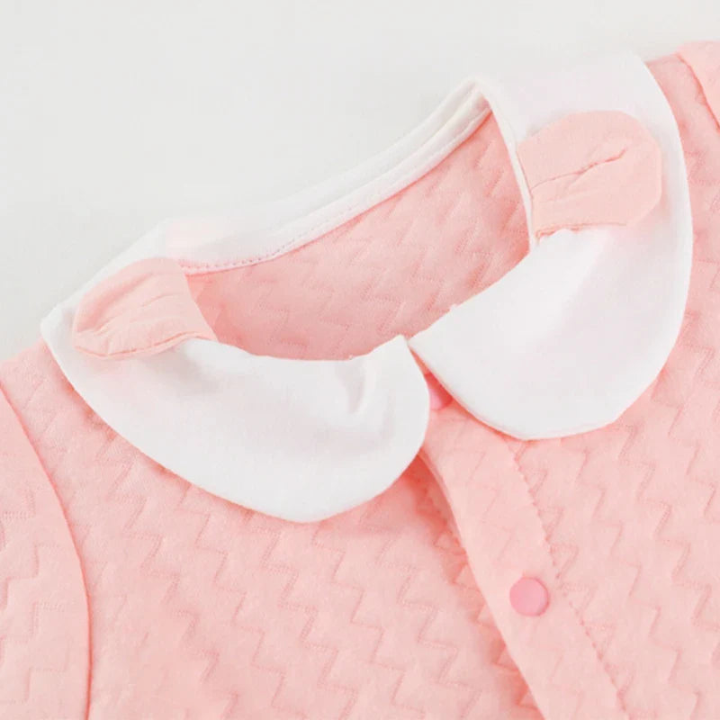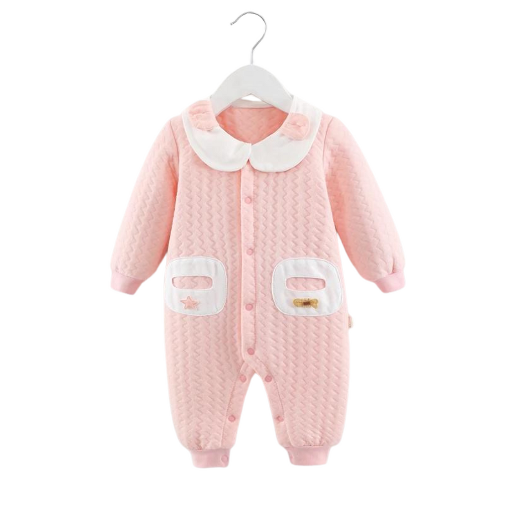 Com um tom rosado suave, detalhes bordados nos bolsos e gola com aplicação delicada, o Macacão Julie é perfeito para vestir sua bebê com carinho, conforto e muito charme. Confeccionado com tecido macio e acolchoado, ele protege a pele sensível do recém-nascido com um toque quentinho e leve.