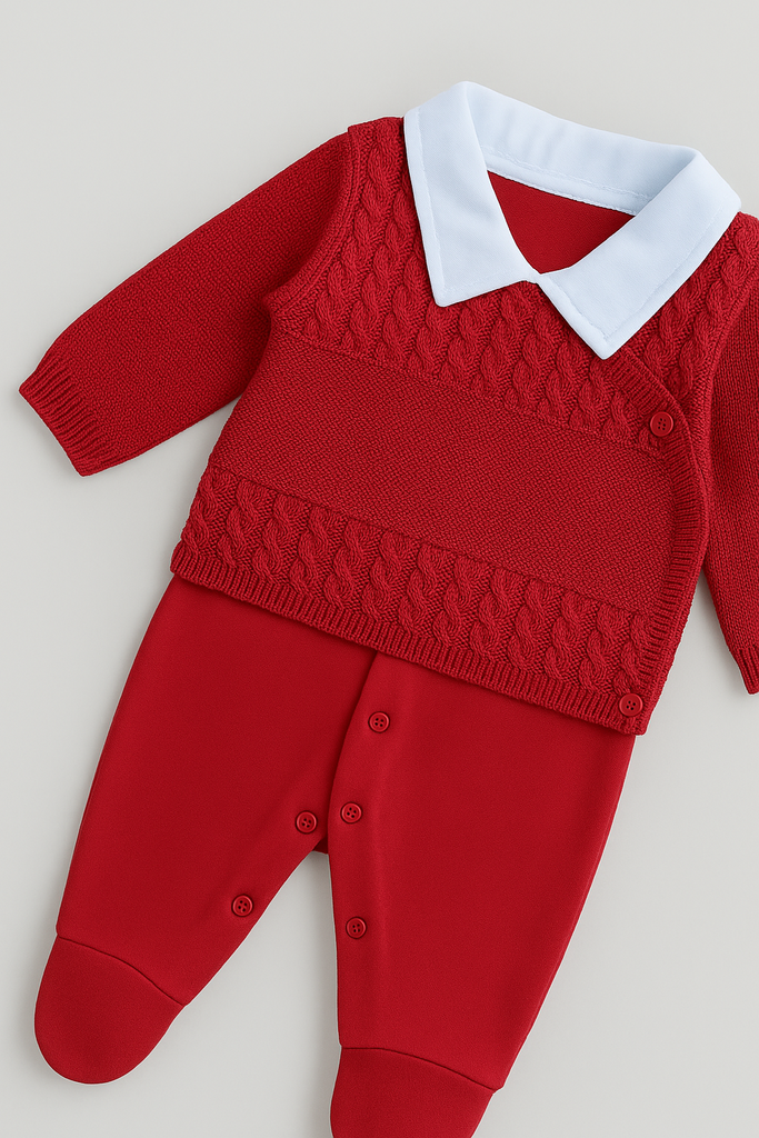 O Kit Saída Maternidade Henry Red é composto por 3 peças em tricot clássico, com acabamento delicado e detalhes em crochê que revelam um cuidado artesanal em cada ponto. A gola social traz elegância, enquanto o tom vermelho profundo carrega a força simbólica do amor que transborda.