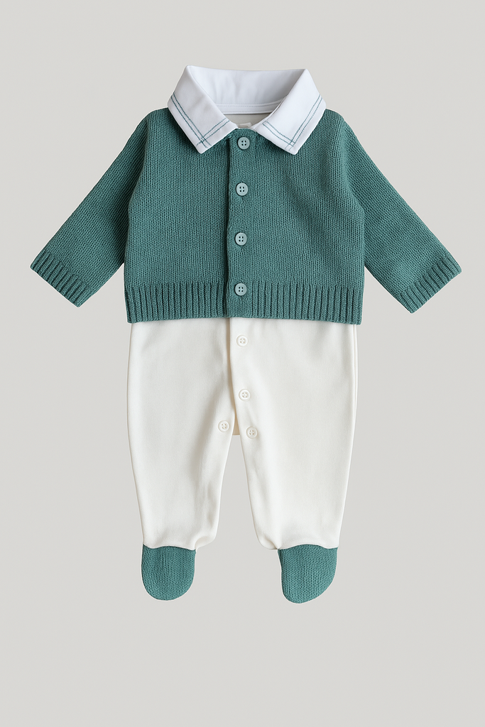 O Kit Saída Maternidade Tricot Menta acompanha quatro peças clássicas: casaquinho com botões frontais, macacão branco com pezinho fechado, gorrinho e manta coordenada – tudo em tricot macio e respirável, pensado para cuidar da pele sensível do recém-nascido.