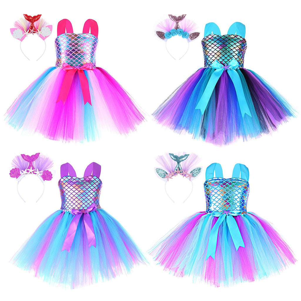 Linda fantasia da Pequena Sereia com saia de tutu, alças em fita de cetim e parte superior elástica.