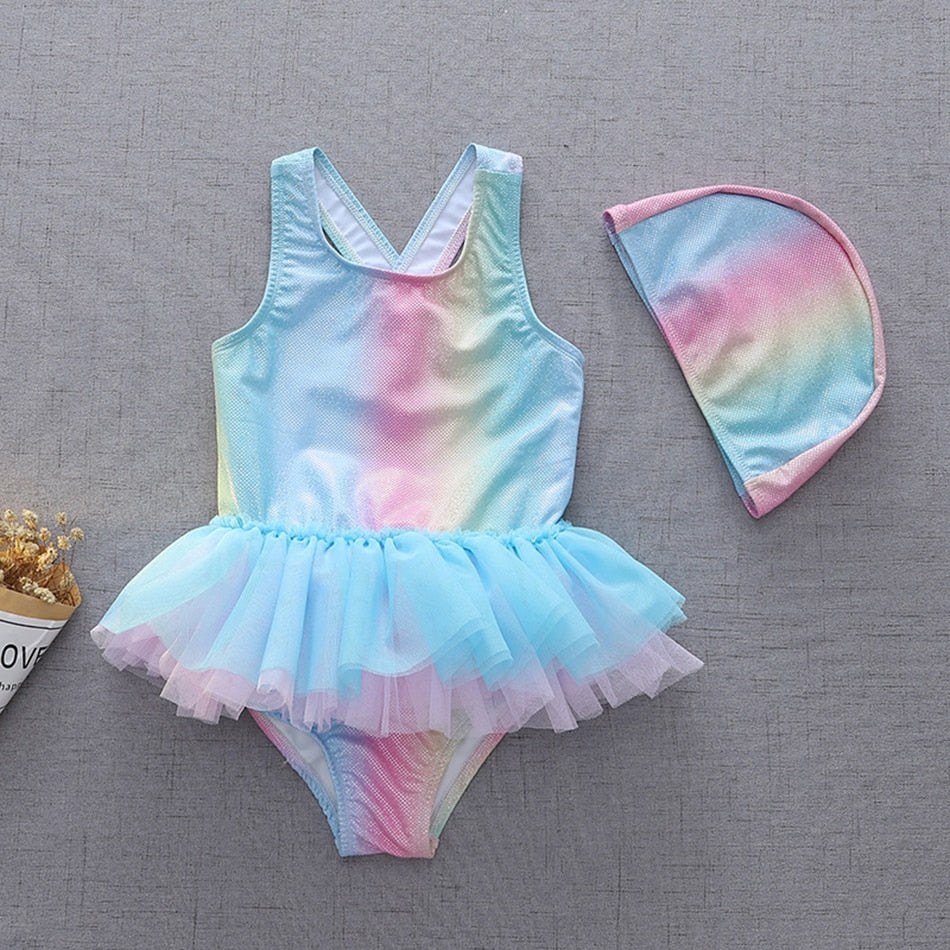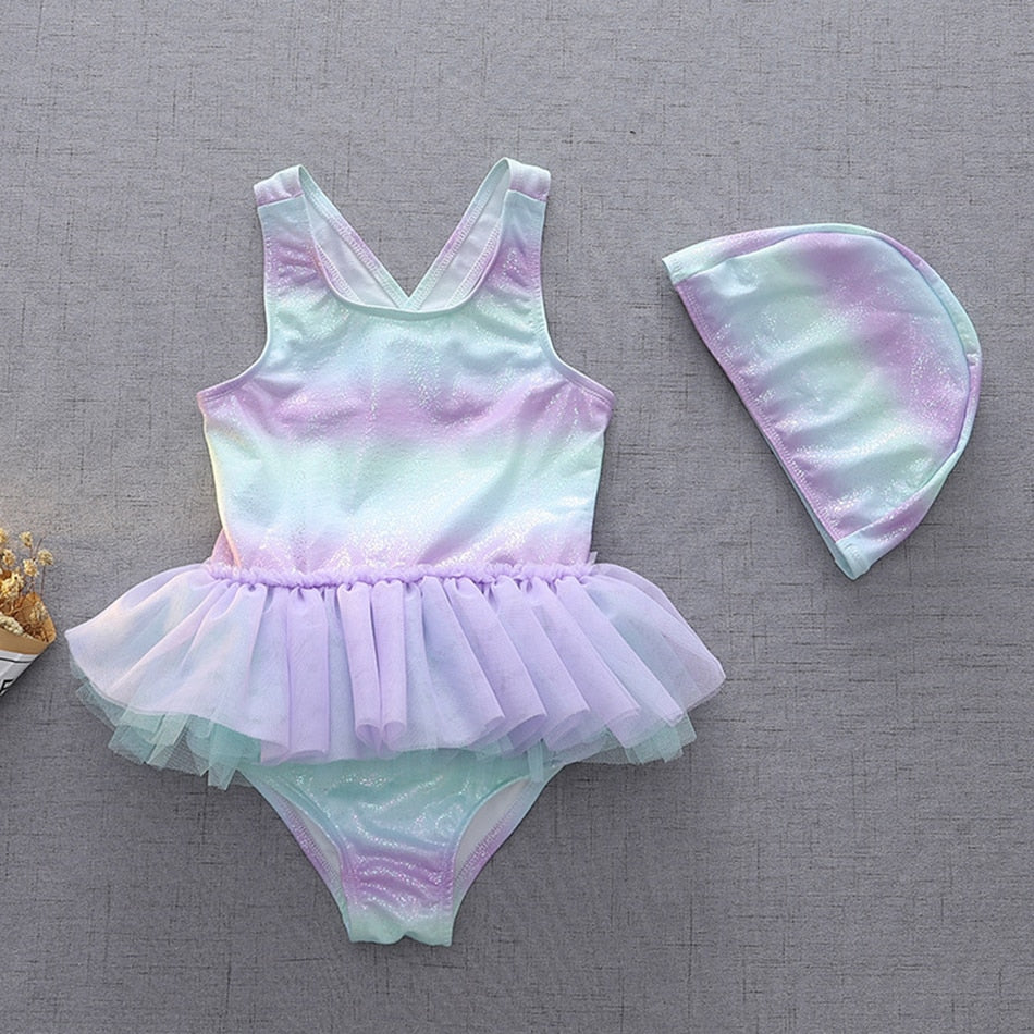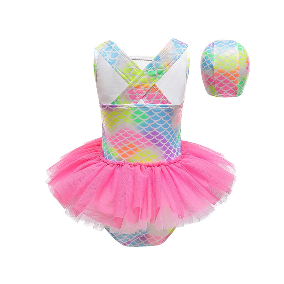 Lindo Maiô para meninas com saia de tutu e tema sereia. Acompanha touca.