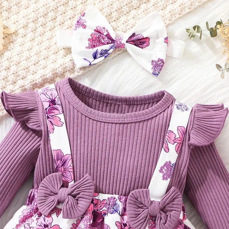 Jardineira Vestido Infantil com Flores e Lacinho para Cabeça